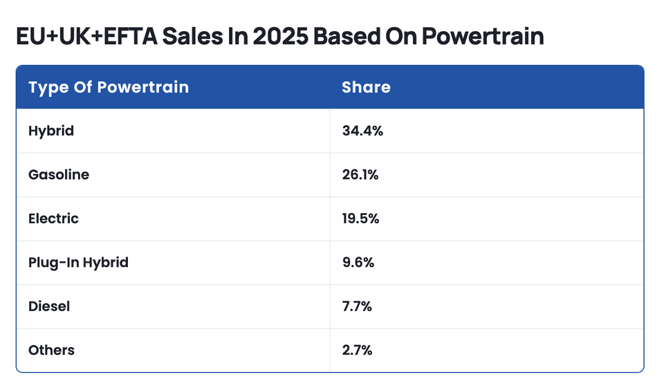 总体而言,混合动力汽车去年在欧盟+英国+欧洲自由贸易联盟地区占据主导地位,市场份额达到34.4%。插电式混合动力汽车的销量历史上首次超过柴油车,占总销量的9.6%。