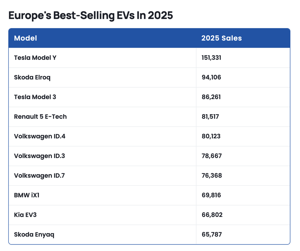 车型方面,尽管特斯拉Model Y的销量下滑了28%,但它仍然稳居榜首,2025年共售出151,331辆。紧随其后的是斯柯达Elroq,销量为94,106辆,Model 3位列第三。