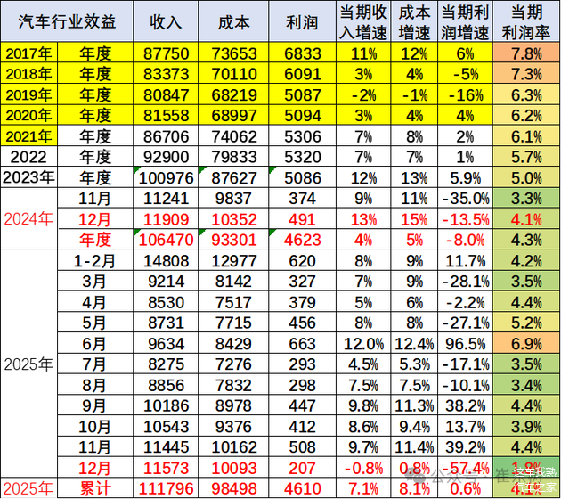 2025年1-12月,汽车行业收入111796亿元,同比增长7.1%;利润为4610亿元,同比微增0.6%;行业利润率仅为4.1%,明显低于下游工业企业5.9%的平均水平。