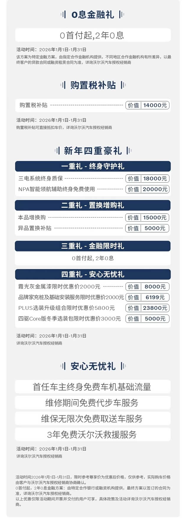 还有0首付起,2年0息的金融方案,价值8000元的霞光灰金属漆仅需2000元、价值6199元的品牌家充桩及基础安装服务只需2000元、价值23800元的PLUS选装升级组合只需5800元,以及原价5000元的四驱Core版冬季选装包只需3000元的福利政策。不是简单的送福利,而是一整套体系化的购车优惠方案,购车压力基本上降低了近一半了。年底购车季,沃尔沃XC70确实值得一看。