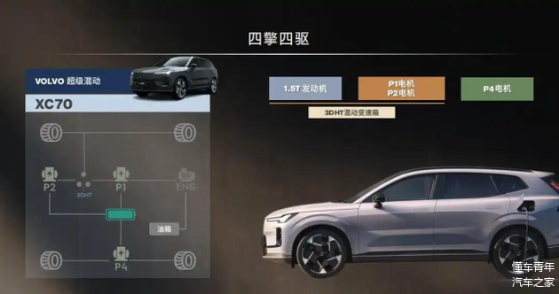 沃尔沃XC70的混合动力总成采用的是P1+P2+P4结构,可能有兄弟不知道这个新能源电机布局里面P几是什么意思,我简单解释一下,其实就是电机的位置,大致可以理解为P0是电机在发动机前端,P1是电机在发动机外壳内,P2是电机在发动机和变速箱之间,P3是电机在变速箱的输出端,P4是电机在后桥差速器里。