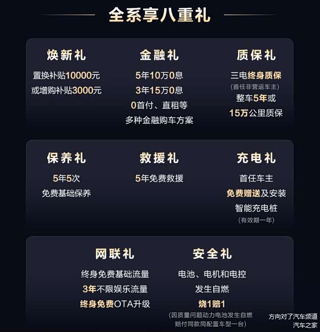 第八重,安全礼:电池、电机和电控发生自燃,烧1赔1(因质量问题动力电池发生自燃赔付同款同配置车型一台)。