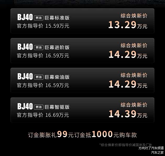 北京越野BJ40燃油巨幕版官方指导价15.59—16.69万元,综合焕新价低至13.29万元。北京越野送上订金膨胀礼:1月27日下订,即可享受“99元订金抵1000元购车款”优惠政策。