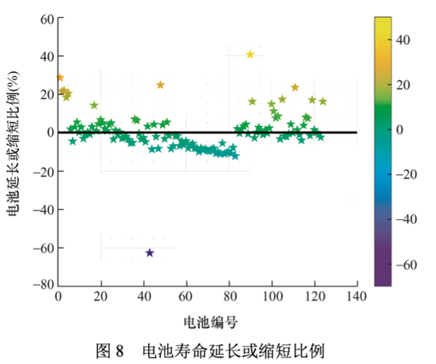 下面这张图表示相比SOH=80%的标准,电池实际延长或者缩短寿命的比例。大部分电池实际寿命缩短了10%或者延长了20%,个别电池寿命甚至能延长40%。