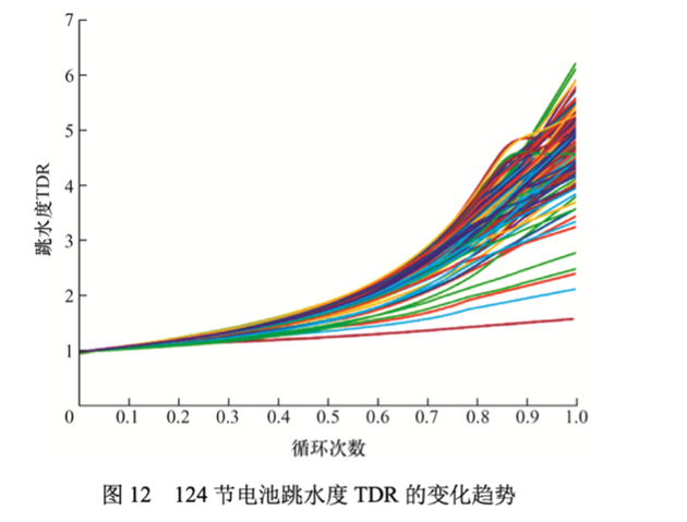 对124节电池TDR的计算显示如下图。随着循环次数增加,TDR逐渐增加。数值最小最稳定的TDR≥1,曲线近似一条直线,表明斜率近似固定,没有明显跳水。意味着电池寿命最长最稳定。