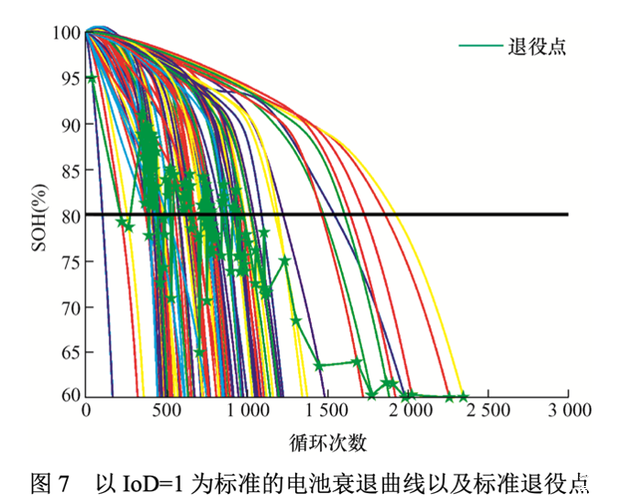 文章中通过对124节磷酸铁锂18650电池IoD的验证,以IoD=1作为电池退役点,得出结论如下图。黑色直线为电池SOH=80%的传统退役标准,绿色五角星标为实际退役点。能看到部分电池循环500-1000次,SOH仍有80%-90%时,实际就应该退役了。而部分电池SOH低于80%,极端的甚至循环到接近2500次,SOH最低到60%,才到实际退役点。