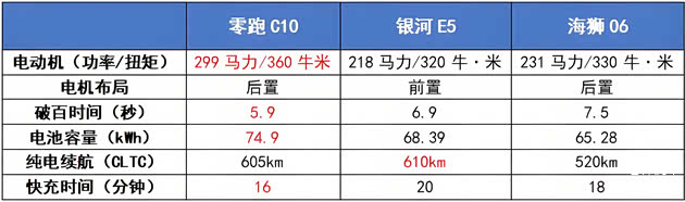 至于电动机功率、破百时间、电池容量和快充时间等方面,都是零跑C10占优势,它的电机拥有299马力/360牛·米的账面数据,5.9秒就能完成零百加速。配备了74.9kWh的磷酸铁锂电池,CLTC纯电续航605km,16分钟就能完成快充,这些方面的表现都十分亮眼。