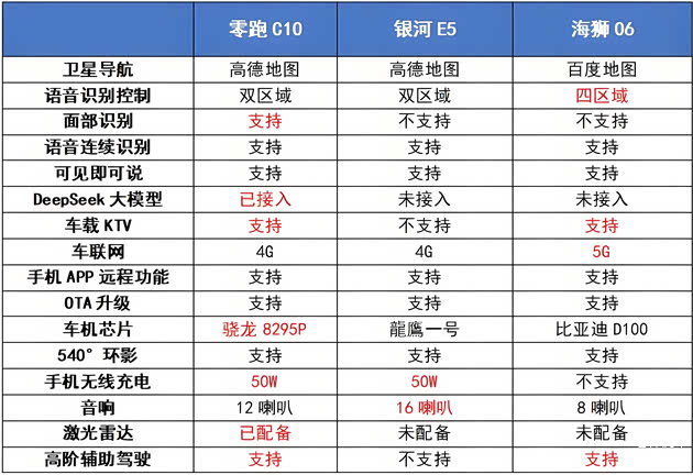 标红的越多,就说明功能和配置越有优势,海狮06标红了4项,银河E5标红了2项,零跑C10标红了7项。零跑C10的配置确实更丰富,功能确实更齐全。