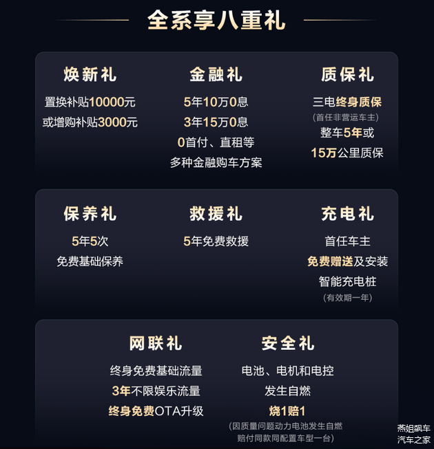第八重,安全礼:电池、电机和电控发生自燃,烧1赔1(因质量问题动力电池发生自燃赔付同款同配置车型一台)。