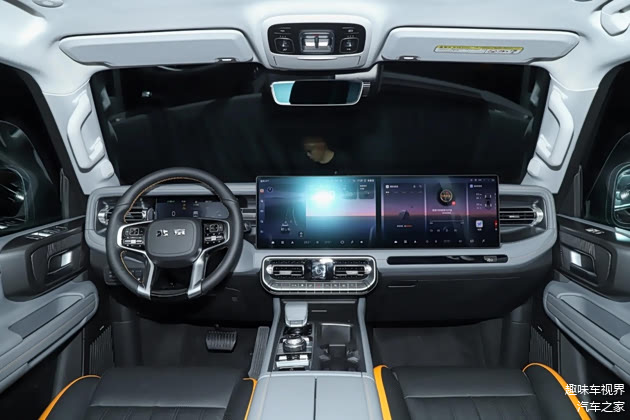 内饰均延续科技与硬朗兼具的风格,核心差异聚焦功能配置。座舱标配10.25英寸全液晶仪表与双12.8英寸中控、副驾双联屏,搭载高通骁龙8155芯片,保障操作流畅度。悦野飞行版车机系统会集成无人机相关功能操作界面,支持语音控制无人机启停、跟拍及影像回传,画面可实时共享给车队,助力路况侦测与营地选址,全程无需手动干预即可完成收纳与充电。赤兔版内饰保持基础布局,通过实体按键与电子换挡杆强化操控便利性,细节处融入越野元素装饰,与外观风格形成呼应。
