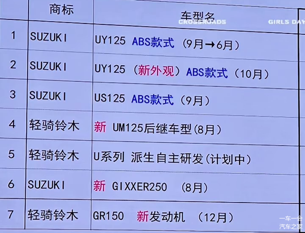 轻骑铃木还将在8月推出UM125后继车型,同时还将基于U系列自主研发新车型。跨骑方面,轻骑铃木终于要引进极客飒250了,只不过似乎有点晚了,国内摩托车市场250cc的热潮已经过去。当然,如果极客飒250能定一个极具诚意的价格,相信摩友们还是会愿意买单的。爆料图上还有一款GR150新发动机,将用在轻骑铃木旗下的通路车上。