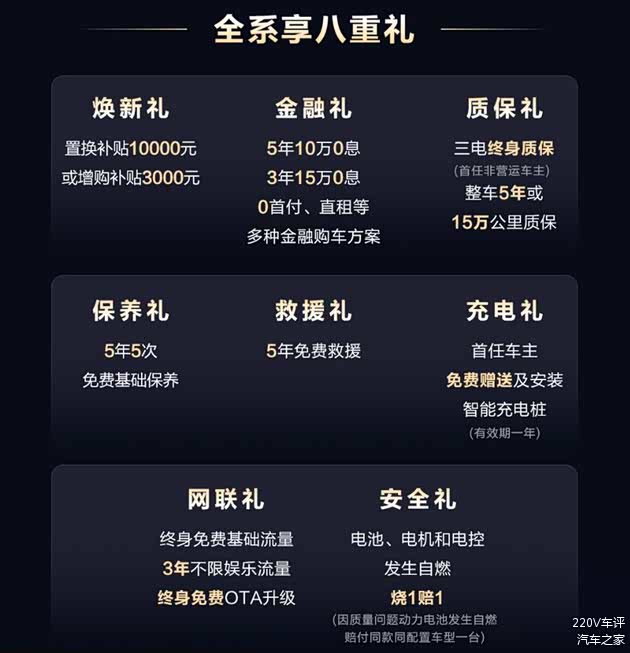 第八重,安全礼:电池、电机和电控发生自燃,烧1赔1(因质量问题动力电池发生自燃赔付同款同配置车型一台)。