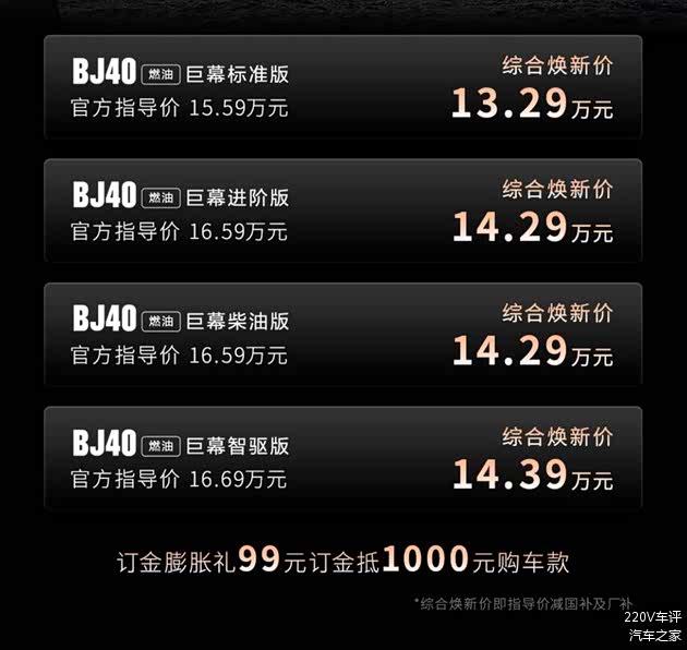 北京越野BJ40燃油巨幕版官方指导价15.59—16.69万元,综合焕新价低至13.29万元。北京越野送上订金膨胀礼:1月27日下订,即可享受“99元订金抵1000元购车款”优惠政策。
