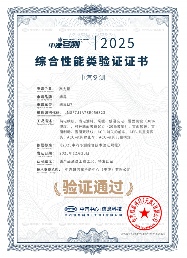 在近期第三方权威机构中汽中心2025冬季测试结果中,全新问界M7表现亮眼,成功拿下“综合性能类验证”与“智能底盘安全技术验证”权威认证。而在日前的“2026问界汽车媒体试驾会”上,全新问界M7在最低-30℃的极寒环境中进行了一系列严苛工况测试,再次印证了其出色的操控实力。