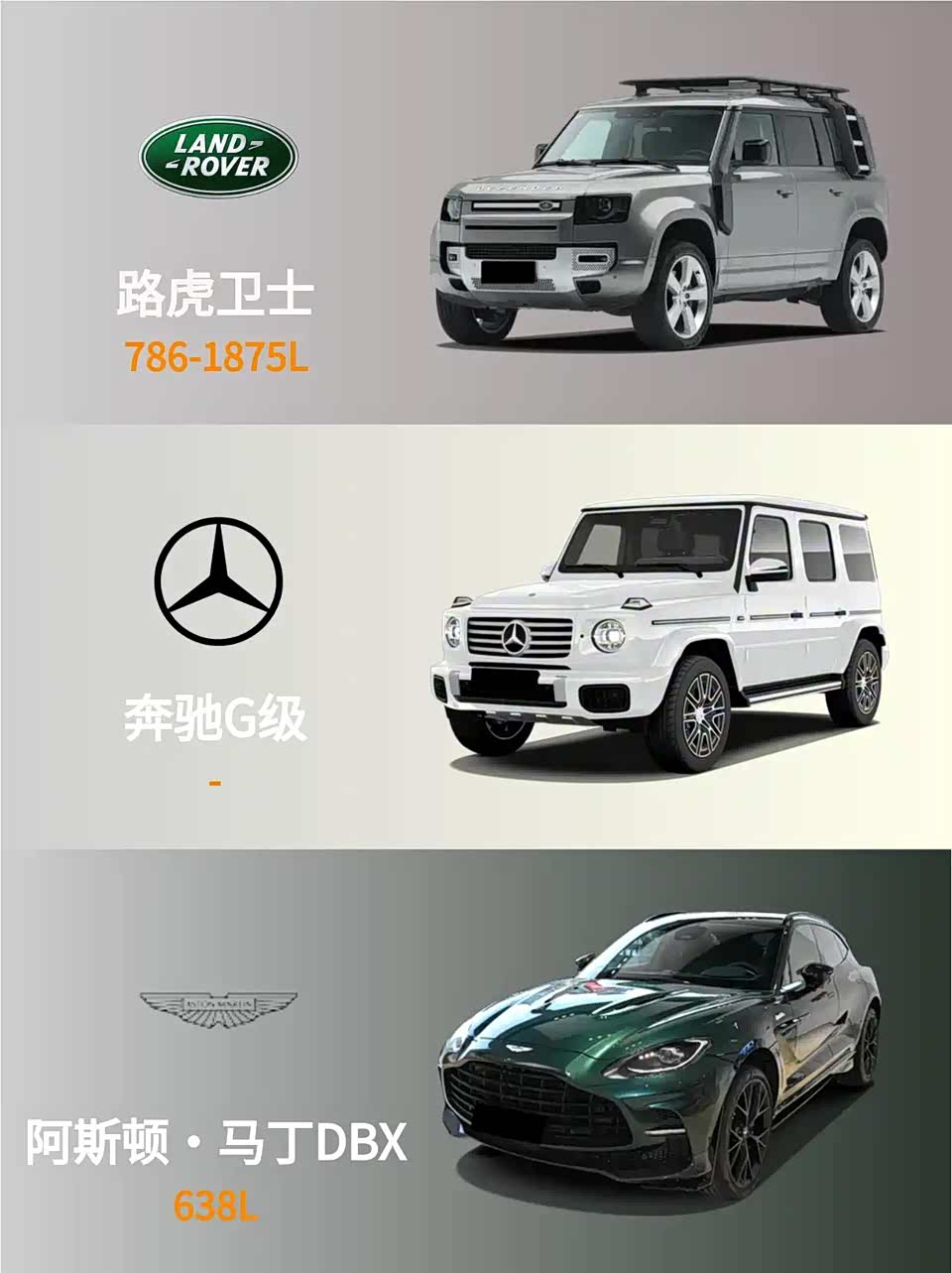 卫士后备箱能塞1.9米冲浪板,二排放倒秒变床车;G500方正尾门装货方便但储物格少得可怜;DBX溜背设计颜值高,但638L后备箱垫底。长途穿越?卫士的1875L拓展空间笑而不语。