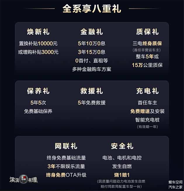 第八重,安全礼:电池、电机和电控发生自燃,烧1赔1(因质量问题动力电池发生自燃赔付同款同配置车型一台)。