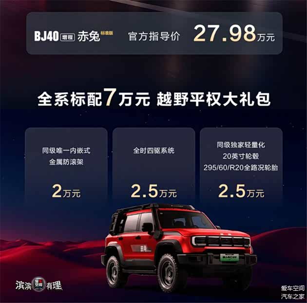 BJ40增程赤兔标准版官方指导价27.98万元!购车即可享有价值7万元的“越野平权大礼包”,包含价值2万元的同级唯一内嵌式金属防滚架、价值2.5万元的全时四驱系统和价值2.5万元的同级唯一轻量化20英寸轮毂与295/60 R20全路况轮胎。