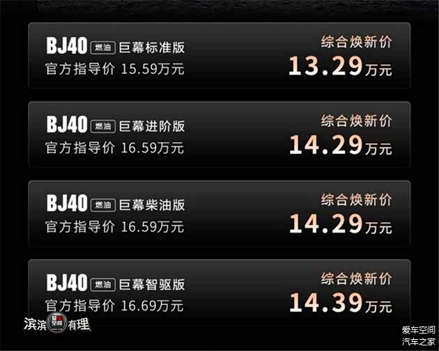 北京越野BJ40燃油巨幕版官方指导价15.59—16.69万元,综合焕新价低至13.29万元。
