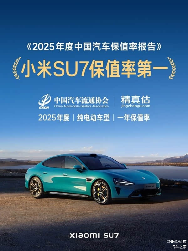 【CNMO科技消息】1月27日,中国汽车流通协会和精真估发布了《2025年度中国汽车保值率报告》。其中,在纯电动车型中,小米SU7“一年保值率”获2025年度第一,保值率达86.05%。