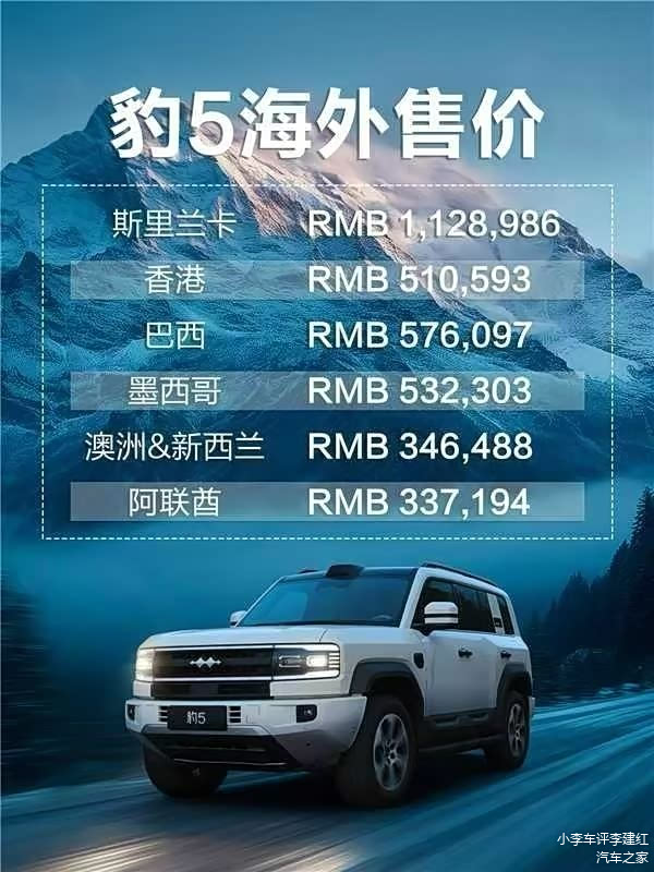 方程豹豹5也是一样,这款车在国内的厂商指导价为23.98万元—32.98万元,但是在海外市场却也是价格飙升,在斯里兰卡卖到了112.9万元,在巴西卖到了57.6万元,在墨西哥卖到了53.2万元,在澳洲和新西兰卖到了34.6万元,在阿联酋卖到了34万元,不管怎么说,都是要比国内的售价要贵出很多的,新能源汽车这玩意,在海外市场确实能挣钱。