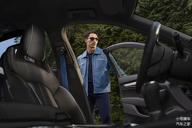 侧面造型方面,车身采用了传统的三厢轿车造型,风格比较稳重,腰线则是贯穿式设计,让车身显得修长大气,同时增强了车身侧面的层次感;轮眉和侧裙部分设计有隆起的筋线,有着比较强的肌肉感;轮毂则是19英寸熏黑锻造设计,搭配有蓝色卡钳。此外,后视镜也采用了熏黑处理,翼子板位置还加入了亮黑色车标,彰显了独特的身份。