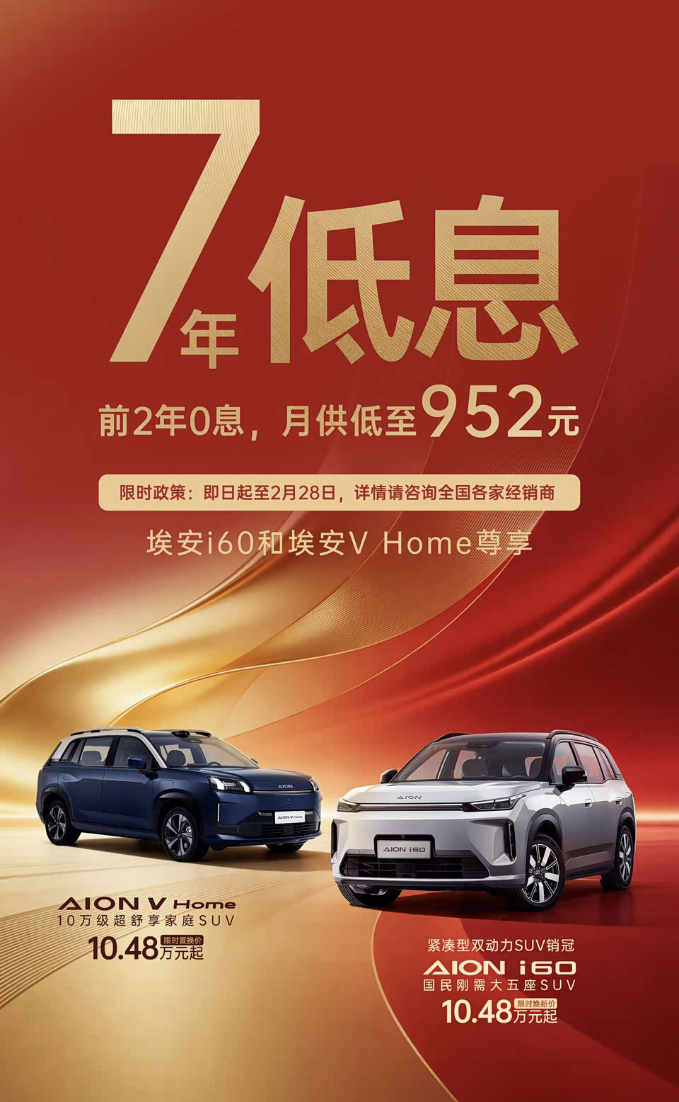 重磅消息!广汽埃安为 i60 与 AION V Home 推出限时金融方案:即日起至2026年2月28日,最长7年低息贷款,前2年免息,月供最低不到1000元。这政策太实在了,购车压力明显小很多,对家庭用户很友好。 广汽埃安这两款国民好车,空间大、坐着舒服,还标配五连杆悬架,开起来更稳。续航方面,不管是增程还是纯电,日常通勤、周末出游都够用。再加上电池、安全方面有厂家“三担责”保障兜底,用户买车更安心。 广汽埃安2026年的目标之一,就是要让用户花更少的钱,就能开上“国民好车”。