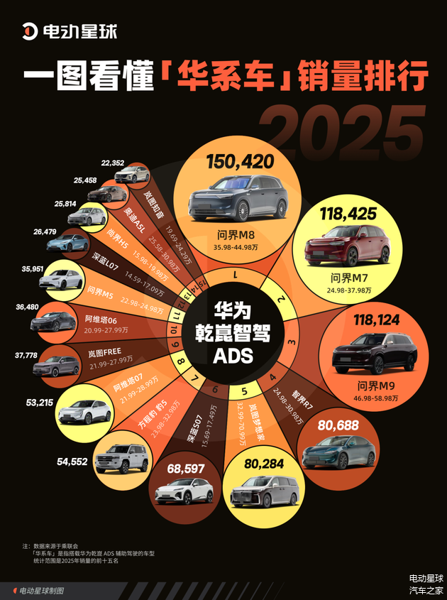 可以直观看到,年销量前五的「华系车」中有 4 款来自「鸿蒙智行」,且问界 M8、M7 和 M9,是仅有的三款年销量超 10 万的「爆款」车型。