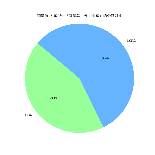 然而,从销量表现来看,「鸿蒙车」以更少的入围数量,却获得了更明显的销量优势:前 15 名车型(系)全年销量 934617 台,其中「鸿蒙车」以 529422 台的表现,占到了前十五总销量的 56.65%;「HI 车」总销量为 405195 台,销量比重仅为 43.35%。