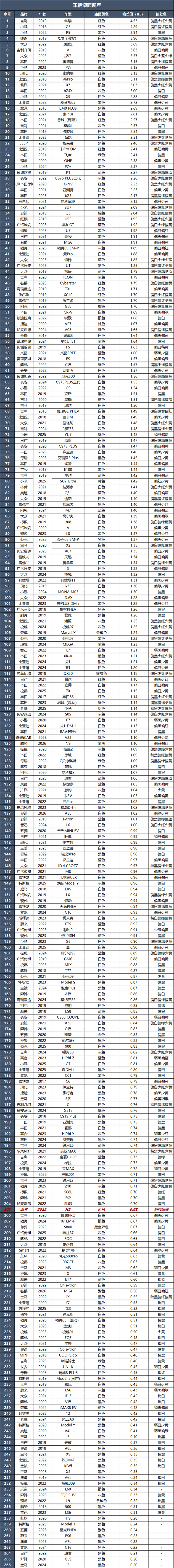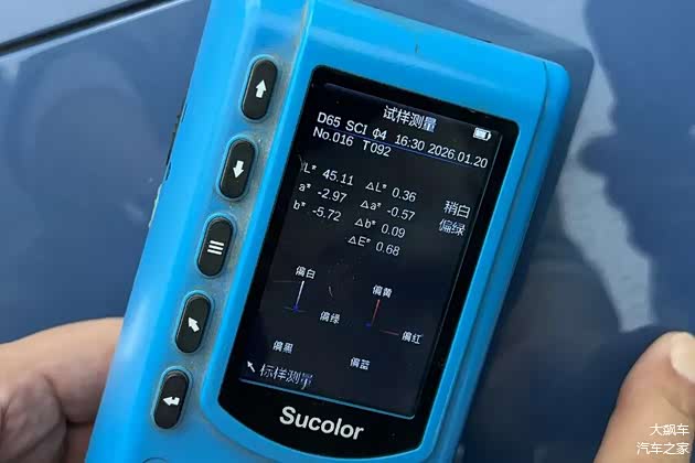 经过测试,最大色差值位于前保险杠处,色差值为0.68ΔE,比基准点稍白偏绿。从数值上来看,这辆车的喷漆工艺质量控制得去确实很好。