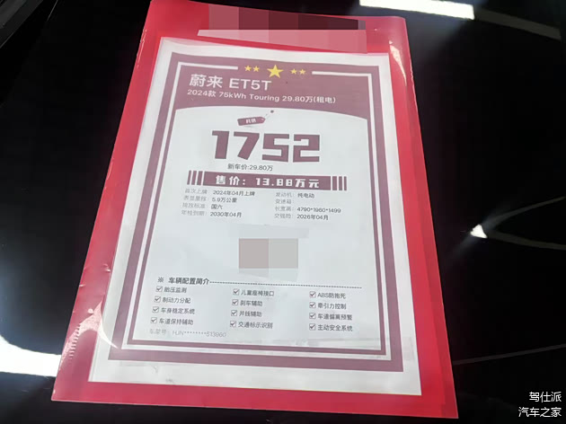 还有一辆2024年4月上牌的蔚来ET5T,新车租电价 29.8 万元,行驶5.9万公里,现在二手落地价 13.88 万元,1 年 9 个月折损 12.92 万元,保值率约为46.6%。