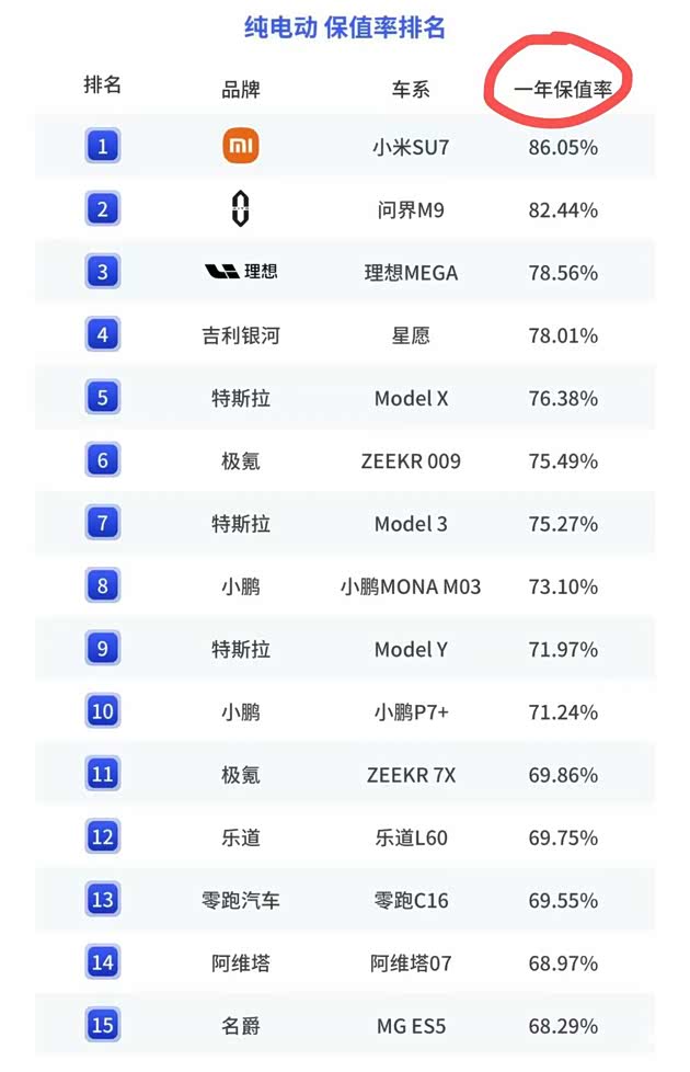 在写这篇文章的时候,我们也查看了中国汽车流通协会和第三方机构“精真估”在1月27日刚刚发布的《2025年度中国汽车保值率报告》(以下简称《报告》),因为小米SU7上市还未满三年,因此《报告》中也只有其一年保值率。