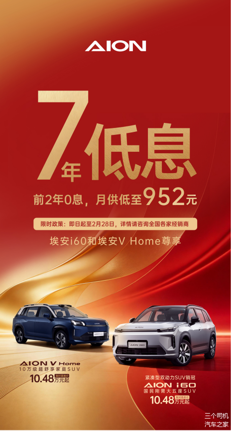 想要买车过年的朋友们注意了,广汽埃安刚刚放出了一个“王炸”金融政策。从即日起到2月28日,购买他们家两款主打家庭市场的车型——i60和V Home,就能申请长达7年的超长贷款,而且前2年还是0利息!算下来,月供最低952元起,每天差不多就是一杯咖啡的钱。