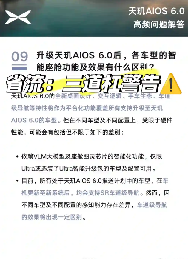 但功能覆盖的“统一性”背后,是不同配置车型的“差异性”。官方明确表示,依赖VLM大模型及座舱图灵芯片的智能化功能,仅向Ultra版本或选装了Ultra智能升级包的车型开放。而最受争议的SR车道级导航功能,虽然所有升级车型都能支持,但受限于不同车型的感知能力,实际效果会存在明显区别。