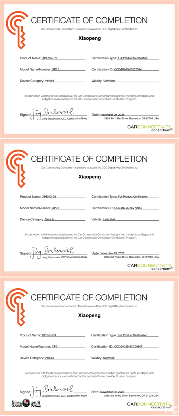 近日,全球车联领域权威组织CCC全球车联联盟(Car Connectivity Consortium®)公布2025年度CCC Digital Key™认证名单,小鹏汽车旗下的P7+、G6、G9车型的数字钥匙成功通过认证,跻身全球首批获此认证的中国车企行列。这一成果不仅标志着小鹏汽车数字钥匙技术达到全球严苛标准,更彰显了中国汽车品牌在智能车联领域的技术实力与创新高度。