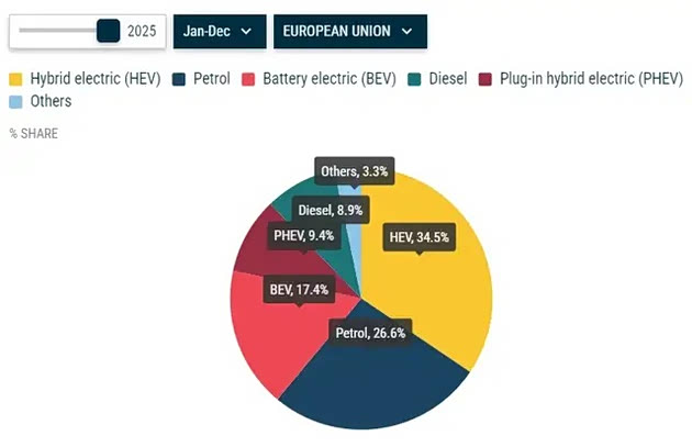 欧洲人发现,all in了这么多年的纯电,最终打败油车的却是混动,2025年欧盟市场HEV+PHEV的市场份额高达43.9%,是纯电的2.5倍!