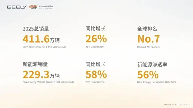 过去5年吉利在新能源领域取得了重大突破,2025年,吉利控股411.6万台总销量中新能源汽车占比56%,销量达229.3万辆,同比增长58%;吉利汽车(含吉利、银河、领克、极氪)新能源销量更是同比暴增90%,达到168.8万辆。