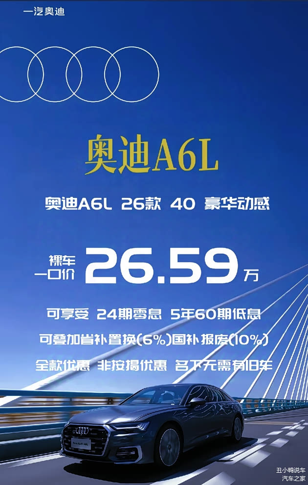 继宝马30款车大降价、奔驰E级一口价31.29万之后,奥迪也坐不住了,直接对自家最重磅的车型 A6L进行超级大降价,一口价干到26.59万!当奥迪A6L宣布这个价格之后,何止是宝马5系和奔驰E级慌了,那些同价格的新能源车更慌,毕竟A6L可是很多人一直梦寐以求的C级豪华车,要品牌有品牌,要面子有面子,配置动力有了,外观内饰也有了,气场更不用说,话撂在这,奥迪A6L是60万以内气场最强C级车,一个能打的都没有,曾经的行政豪华轿车真不是随口说说。奈何以前入门版落地价都要45万以上,还是全款的情况下,很多人买不起,现在奥迪也是豁出去了,降到26.59万,还要啥自行车啊,放在三四年以前,想都不敢想!