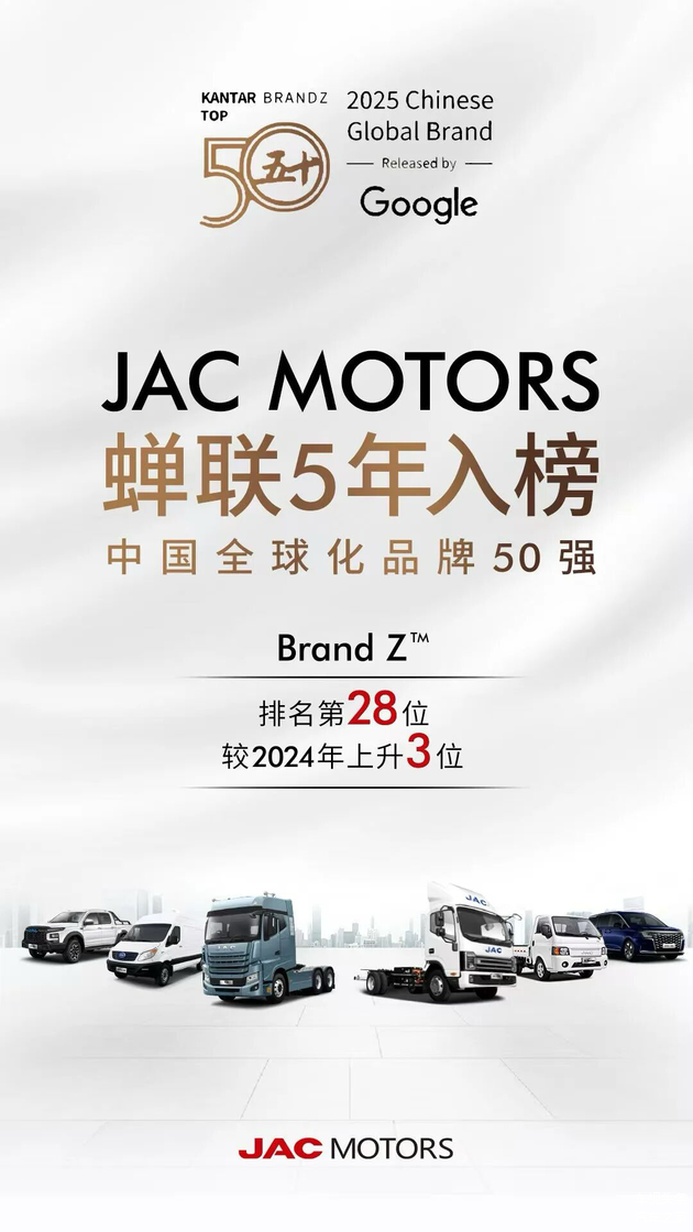 面对国际市场竞争加剧的挑战,江淮汽车全球化战略并未放缓,而是向“深度本地化”转型,全年稳居中国汽车出口企业前十行列,蝉联BrandZ中国全球化品牌50强,并入选 “中国出海品牌100强”。