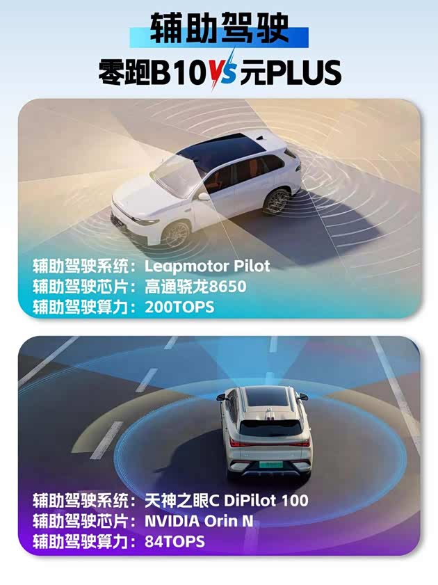 零跑B10多少有点过分了,在这个价位给配到了一颗禾赛科技128线束的激光雷达,11颗摄像头、3颗毫米波雷达、12颗超声波雷达,一颗高通骁龙8650辅助驾驶芯片,运行算力200TOPS。仅仅硬件上就要比元PLUS强太多了,实现的辅助驾驶功能也更多,比如信号灯识别、车侧盲区影像、城市路段导航辅助驾驶、前车驶离提醒、车辆召唤功能、记忆泊车等高阶辅助驾驶功能。最重要的是激光雷达相比纯视觉的辅助驾驶安全冗余要更好,尤其是春节返乡长途驾驶减轻疲劳,也更加安全。而自动泊车功能更是新手福音,如果春节返乡走亲戚,遇到小区狭窄车位也不用担心,系统能精准识别,自动规划路线,全程无需碰方向盘和油门,就算是超窄车位也能稳稳停入,比老司机操作还靠谱。