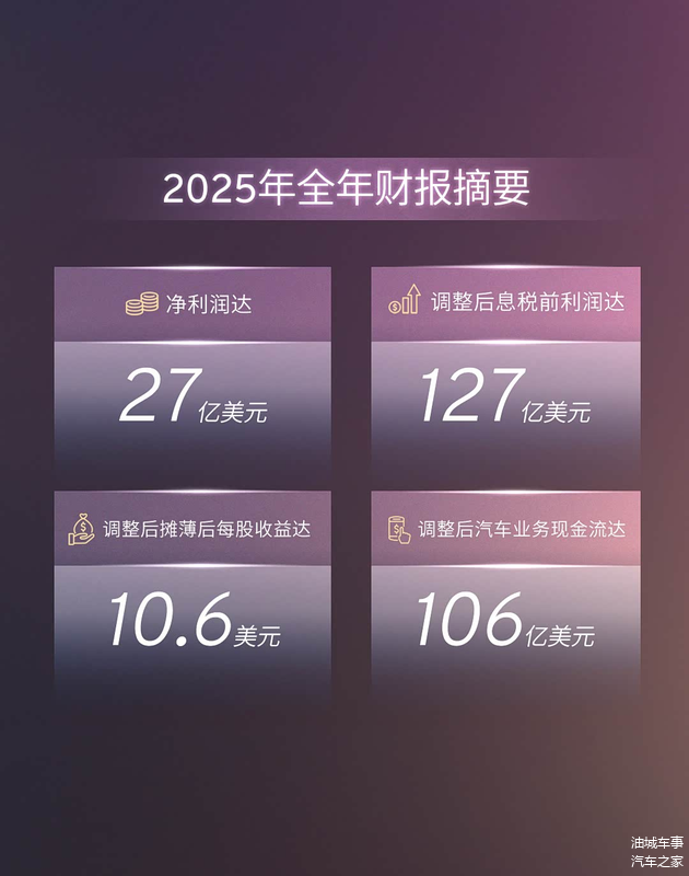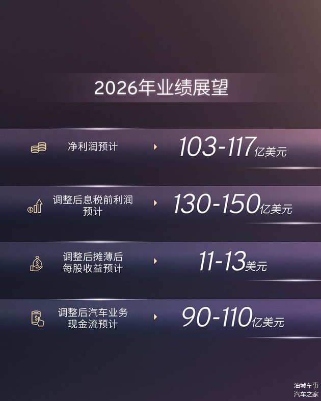 同时,公司预计2026年全年的调整后息税前利润将达到130亿美元到150亿美元,换算成人民币约为902.9亿元到1041.8亿元。此外,在调整后的汽车业务现金流方面,管理层给出了90亿美元至110亿美元的指引区间,约合625.1亿元至764亿元人民币。