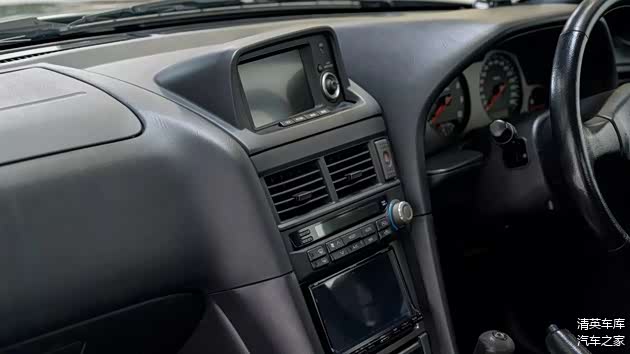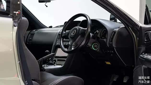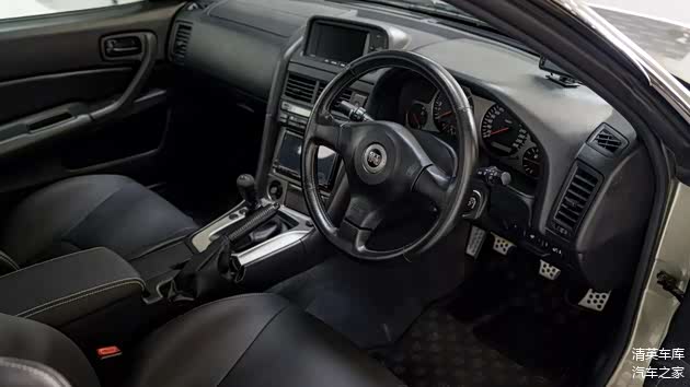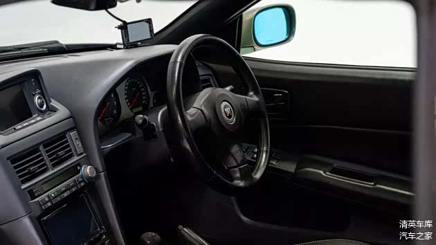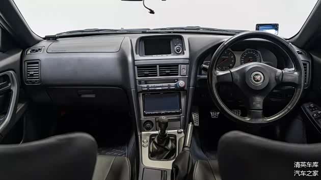内饰方面,车辆保留原装M-Spec黑色皮革包裹的前排桶椅,升级了现代化的Eclipse车机主机,整体看来历年保养状况良好。车身涂装为Millennium Jade,这可谓是R34上最具收藏价值的颜色,也是其视觉魅力与市场吸引力的关键因素之一。