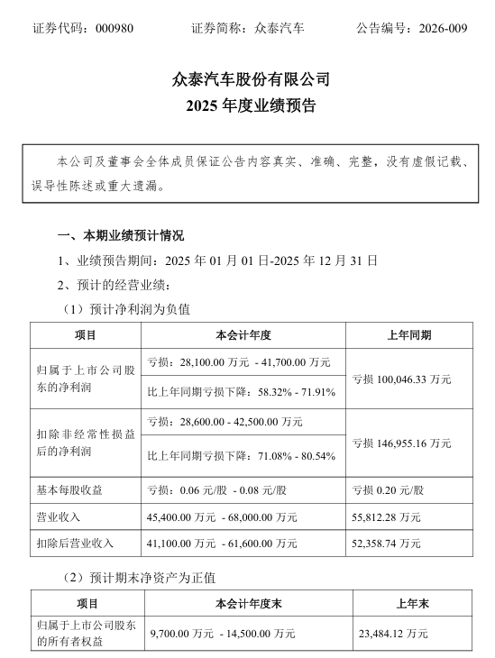 【众泰汽车:预计2025年净利润亏损2.81亿元-4.17亿元】 众泰汽车公告称,众泰汽车预计2025年归属于上市公司股东的净利润为亏损2.81亿元至4.17亿元,上年同期亏损10亿元。业绩亏损主要系整车板块因历史遗留问题基本处于停工状态,同时为维持公司基本框架及推进复工复产,仍需承担必要的管理费用、财务费用等刚性固定支出。