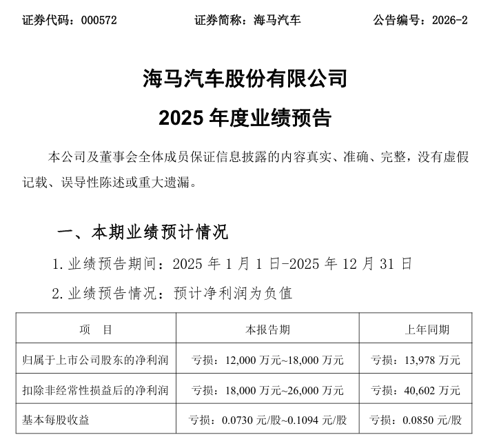 【海马汽车:预计2025年净亏损1.2亿元-1.8亿元】 海马汽车1月28日公告,预计2025年归母净利润亏损1.2亿元-1.8亿元,上年同期亏损1.4亿元。报告期内,公司汽车销量、营业收入较上年同期略有增长。同时,公司有效降低了相关成本和费用,经营负担进一步减轻,扣除非经常性损益后的净利润亏损幅度收窄。
