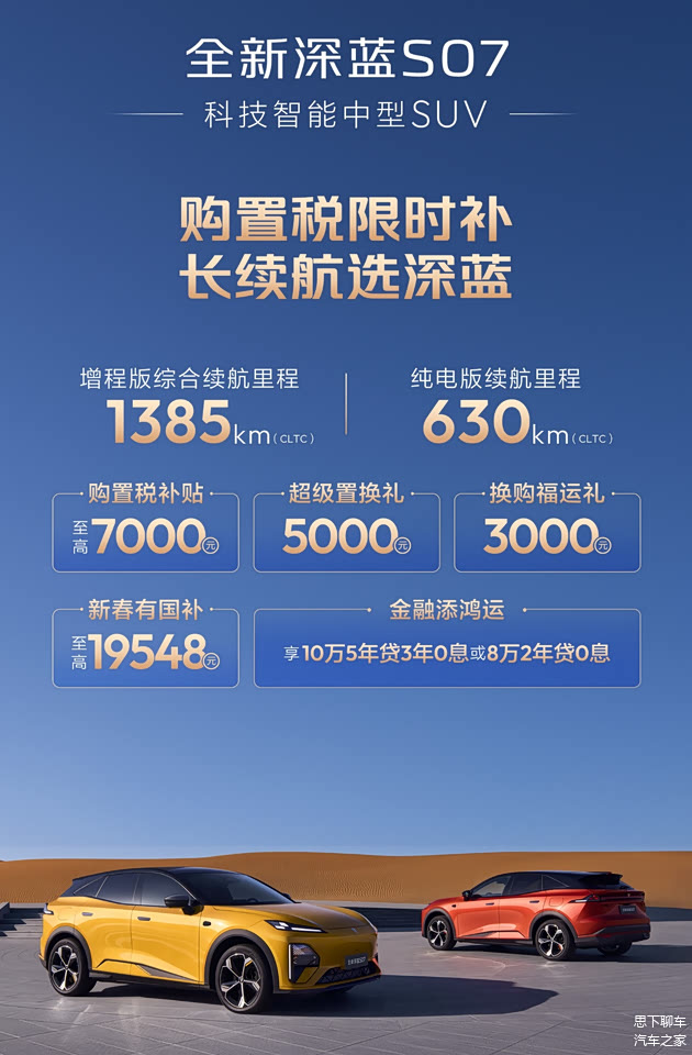为了诸多有新春购车/换车、过年返乡自驾需求的用户,深蓝S07给出了多种优惠政策,除了能拿到至高3万4的购车补贴,更重要的是新车充足,助你过年稳稳回家。