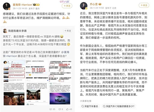 (左为:事源、深蓝CEO表态,右为:极狐乔心昱回应)