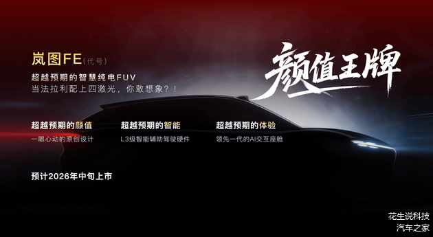 “岚图汽车”联合“华为乾崑”将在2026年中旬重磅推出“超越预期的智慧纯电FUV”,项目代号“岚图FE”。这一次,岚图直接“亮牌”:高颜值的设计美学,行业领先的四激光雷达感知系统,L3级智能辅助驾驶硬件,领先一代的AI交互智能座舱。