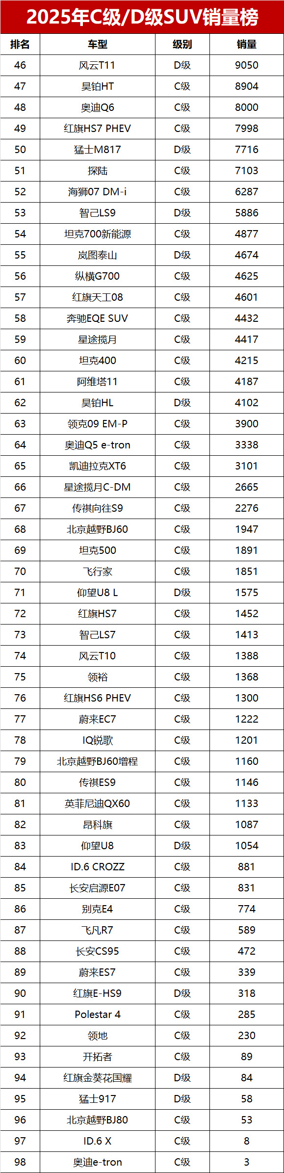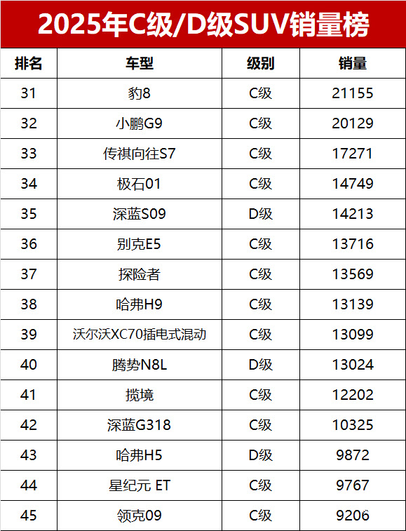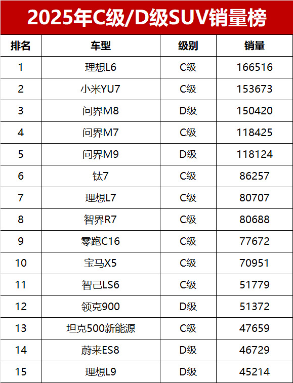 【2025全年C级/D级SUV销量排行榜】放在几年前,国内C级和D级SUV市场还是豪华合资品牌的主场。但2025年,自主品牌凭借新能源车型的密集发力,彻底改写了市场格局,不仅实现销量反超,更带动整个细分市场迎来爆发式增长。乘联会数据显示,2025年国内C级SUV市场全年零售销量达75.5万辆,同比大幅增长60.2%,在乘用车市场的份额提升至3.2%,C级与D级SUV市场整体呈现出“自主领跑、新能源主导”的鲜明特征。