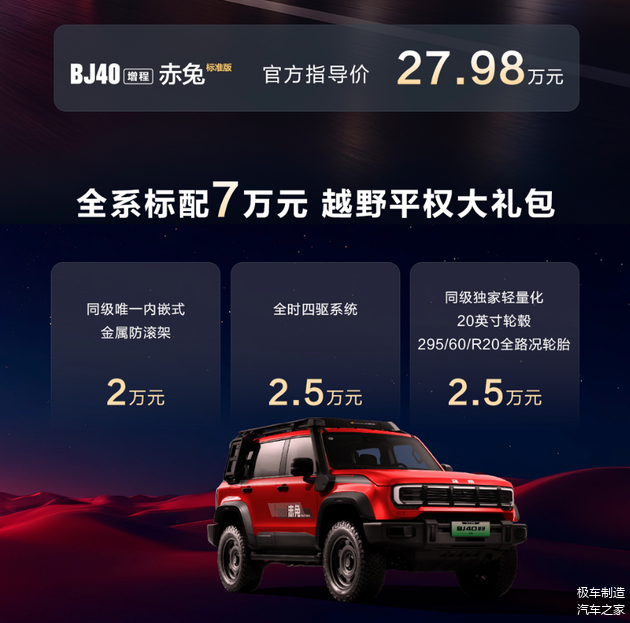 此次BJ40家族的产品扩充,体现了北京越野对差异化市场需求的精准把握。三款新车型覆盖了从官方改装、智能娱乐到科技探索的不同维度:BJ40增程赤兔标准版以27.98万元的官方指导价,提供了价值7万元的“越野平权大礼包”,将内嵌式金属防滚架、全时四驱系统等专业配置作为标准装备;BJ40燃油巨幕版以13.29万元的入门价格,搭载了双15.6英寸悬浮双联屏等智能娱乐配置;而预售价24.78万元的BJ40增程悦野飞行版,则创新性地整合了越野专用无人机系统。这种梯度化、差异化的产品布局,不仅丰富了消费者的选择空间,更展现出品牌对硬派越野车型价值重构的思考。
