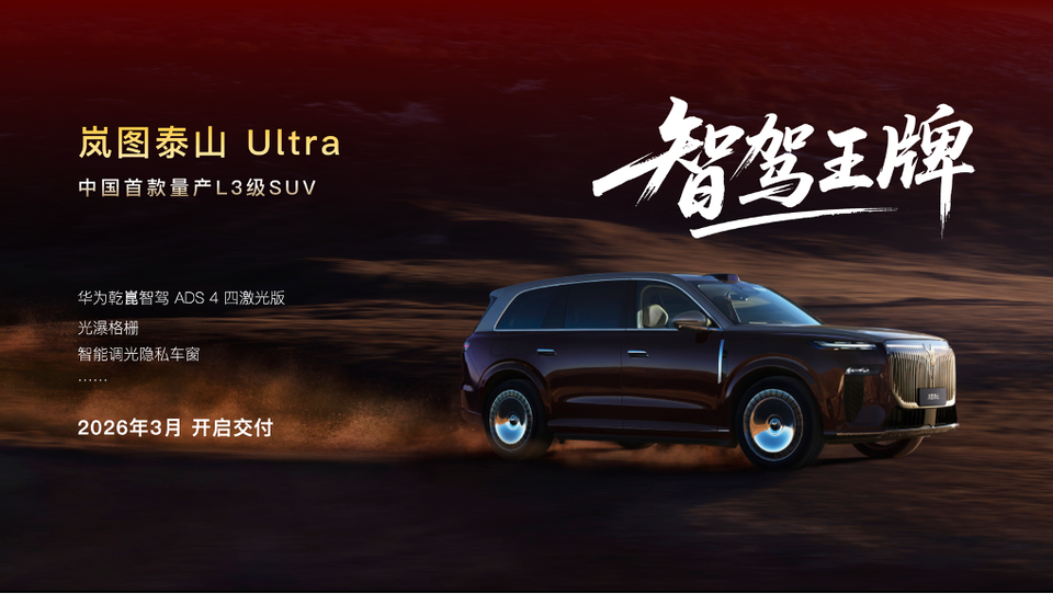2026年1月28日,岚图汽车在年终媒体答谢会上宣布,岚图泰山Ultra将于今年3月正式开启交付。作为岚图汽车冲击L3赛道的重磅产品,岚图泰山Ultra完全按照L3级自动驾驶架构设计,并搭载最新的华为乾崑智驾四激光方案。