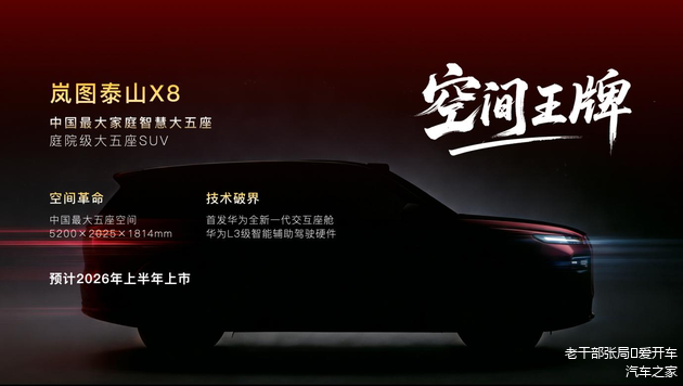2026年,相当于岚图泰山五座版,尺寸和岚图泰山相近,对标极氪8X,但实际也要猛攻问界M7五座版。将首发搭载华为新一代交互座舱和L3,参考泰山37.99万的起售价,泰山8X大概率定位在30-35万级。新车将在上半年上市。